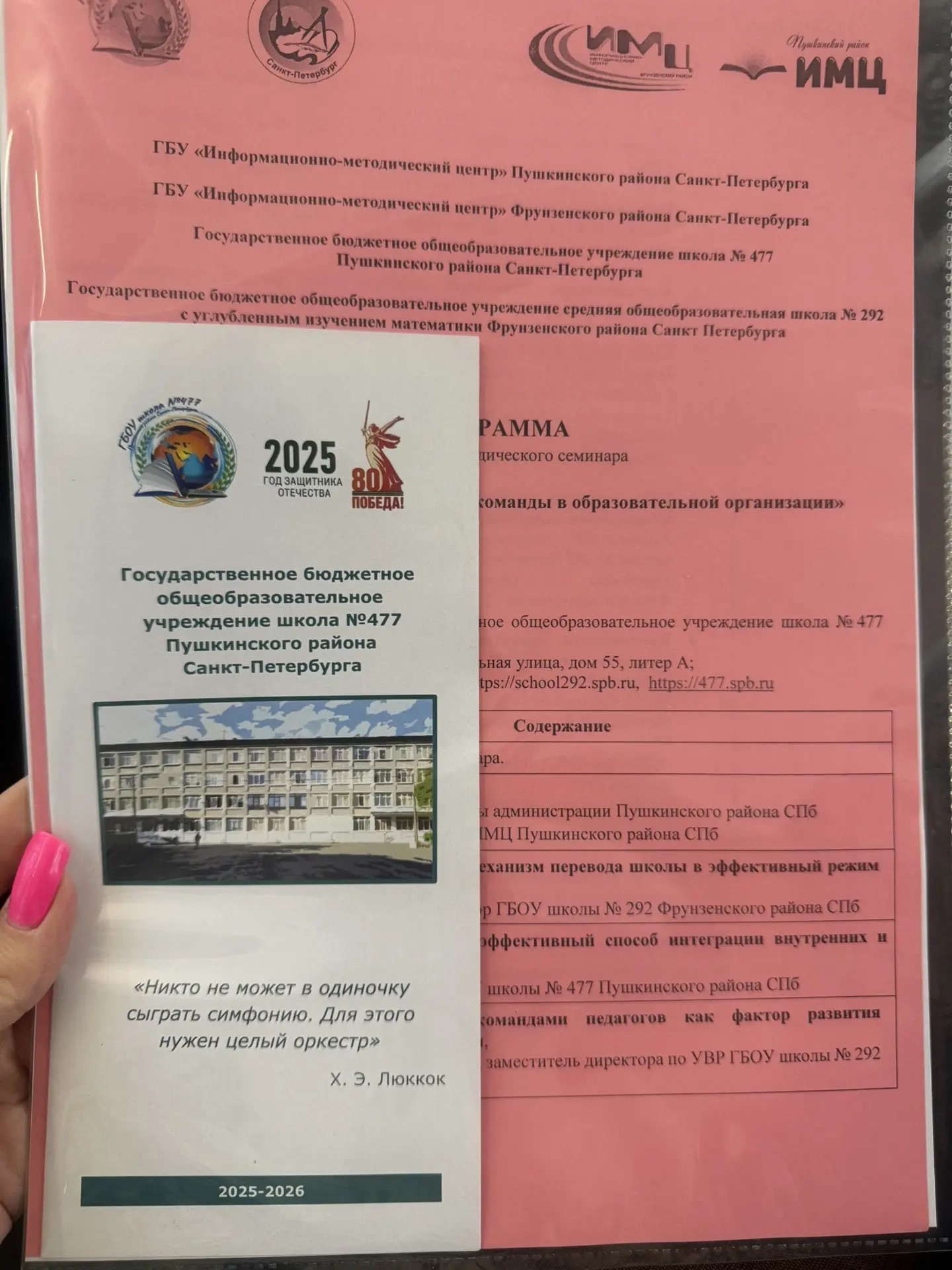 23 декабря 2025 года на базе ГБОУ школа 477 Пушкинского района Санкт-Петербурга прошел городской методический семинар «Создание проектной управленческой команды в образовательной организации». Семинар начался с приветственного слова директора ГБУ ИМЦ Пушкинского района СПб Симоновой А.В. С докладами выступили: директор школы ГБОУ школа 292 Фрунзенского района Пятышева М.В., директор ГБОУ школа 477 Пушкинского района СПб Прошкина Е.В., заместитель директора по УВР ГБОУ школа 292 Тарасова Т.В. В ходе семинара рассказывали об основных характеристиках лидера, знакомились с ключевыми моделями, типами и стилями лидерства. Обсуждали принципы командообразования и основные рекомендации по развитию лидерских качеств. Затем прошли мастер-классы по четырем секциям. Участники мастер-классов обсудили практические стратегии формирования проектной управленческой команды для организации масштабных социально значимых мероприятий, роль команды поддержки в сопровождении педагогов — участников конкурсного движения и возможности проектной команды в выявлении и сопровождении одарённых детей в школе. По окончании семинара подвели итоги. Семинар стал площадкой для обмена опытом и определения векторов развития образовательных организаций Санкт-Петербурга.
